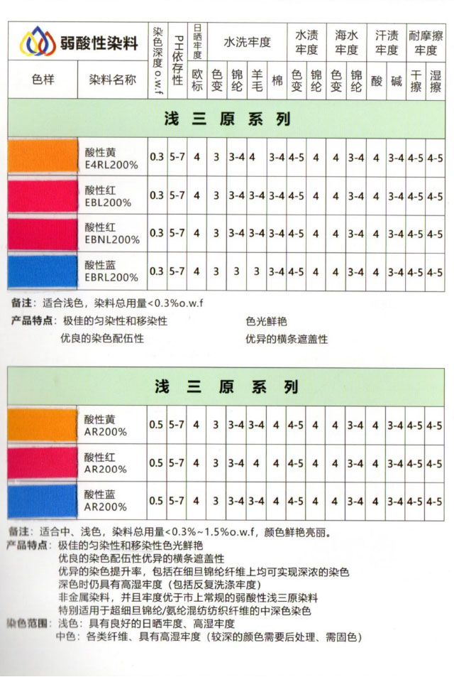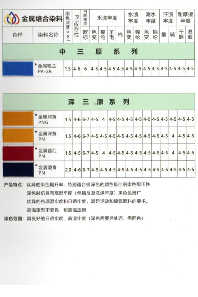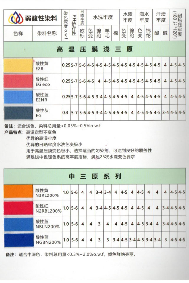 高牢度分散染料作為合成纖維染色的核心材料,以分子結構小、不含水溶性基團為特征,需借助分散劑實現均勻染色。其技術特性聚焦于色牢度提升,涵蓋耐洗、耐光、耐摩擦、耐升華等多維度性能,采用五級制評級體系(耐光牢度為八級),級數越高代表性能越優(yōu)。例如,蒽醌結構染料因分子穩(wěn)定性高,耐曬、耐熱性能顯著;偶氮…